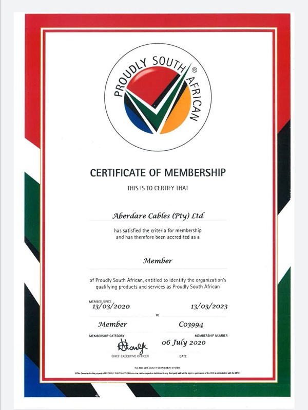 A membership certificate of Proudly South African was conferred on Aberdare, Hengtong’s South African subsidiary, recently in praise of its products and service.
